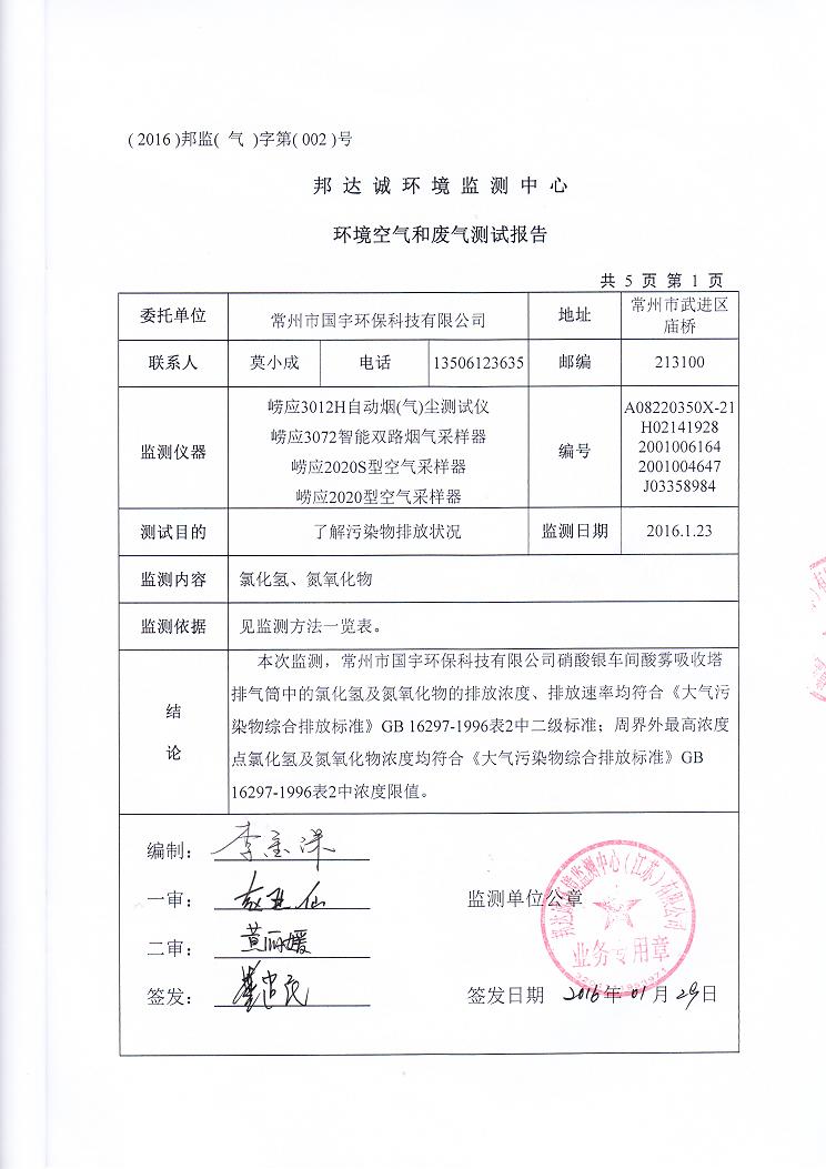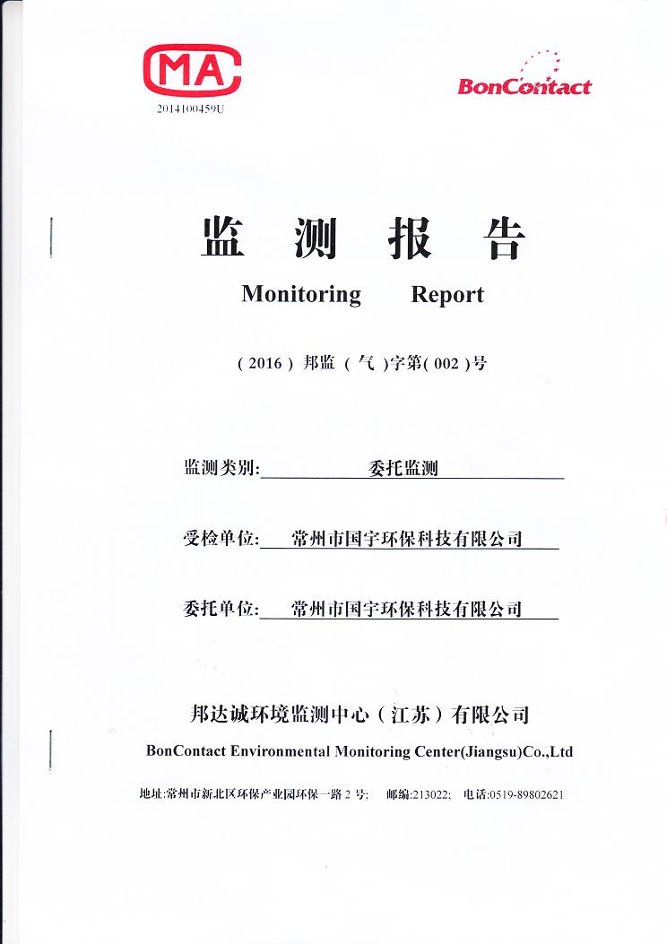 2016年常州市國(guó)宇環(huán)??萍加邢薰練獗O(jiān)測(cè)報(bào)告網(wǎng)上公示