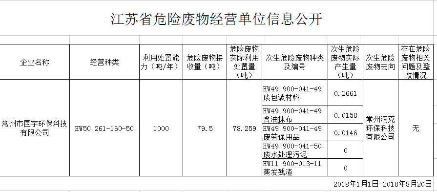 常州市國(guó)宇環(huán)??萍加邢薰窘K省危險(xiǎn)廢物經(jīng)營(yíng)單位信息公開(kāi)